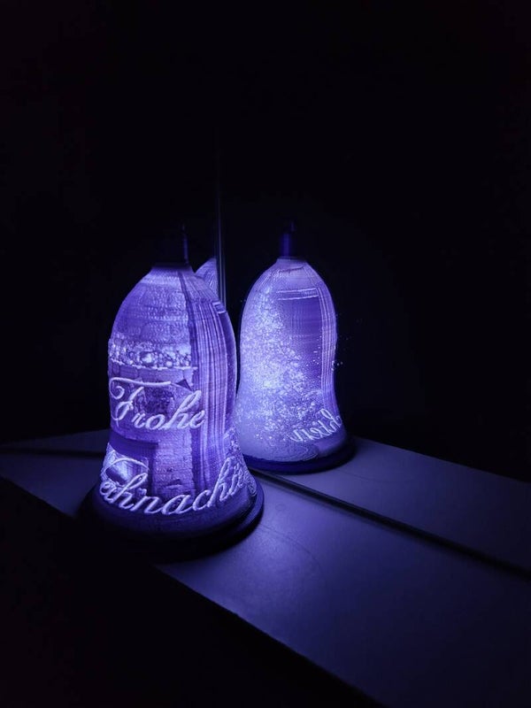 Weihnachtsglocke verschiedene Motive sind zum hinstellen aber auch zum aufhängen. gie größe ist ca. 120mm hoch. Besteht aus PLA und mit LED Beleuchtung mit 2AA Batterien. Ausserdem haben die Glocken einen 6h Timer.